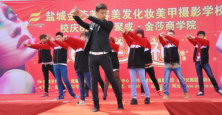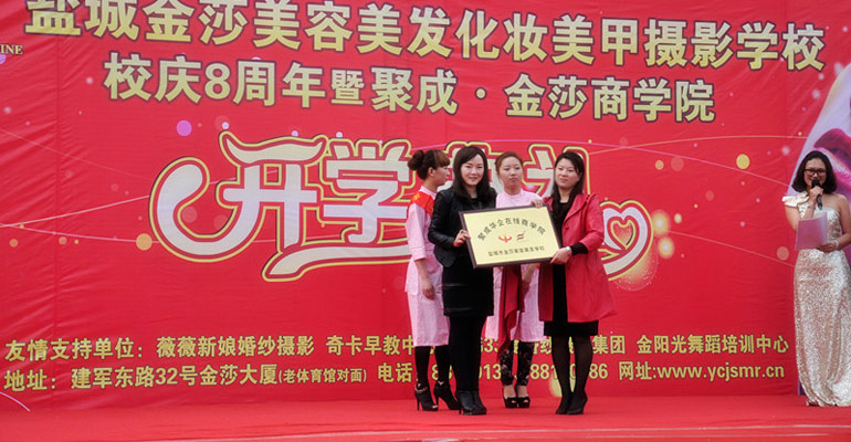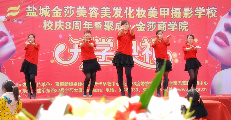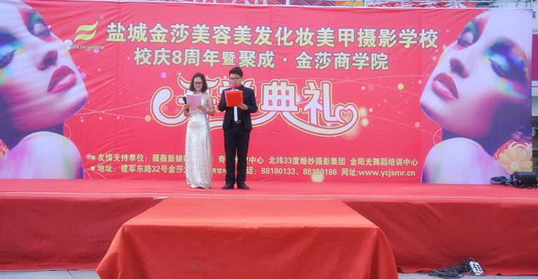 2013年4月13日,盐城金莎学校迎来了八周年校庆暨开学典礼,老师和学员们精心准备了一场盛大的演出,活动现场气氛热烈,人潮涌动,化妆班的彩妆秀更是将整场活动推向了高潮。