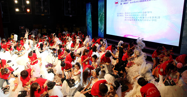 在热情似火的七月里,8日由江苏省苏州工商行政管理局、苏州市人力资源和社会保障局、苏州市总工会、苏州市妇女联合会、苏州市民营企业协会、苏州市个体劳动者协会、苏州市美容美发行业协会联合主办的“2013第五届中国·苏州美容文化艺术节”暨由苏州市人力资源和社会保障局主办,苏州市美容美发行业协会、苏州市庆典礼仪与形象设计职教集团、苏州金莎美容美发化妆培训学校承办的“澳美杯”苏州市2013美容美发美甲技能大赛在苏州公共文化活动中心隆重举行。来自各主办单位、承办单位、协办单位以及中美协、省美协、各兄弟协会的领导,全省美容美发化妆美甲行业的朋友们、参赛选手、模特等近1500人出席了活动。